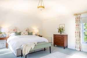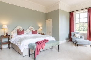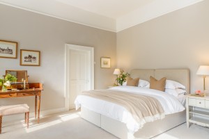 The master bedroom of the house. The spacious bedroom overlooks the exquisite gardens and features its own distinct ensuite bathroom.